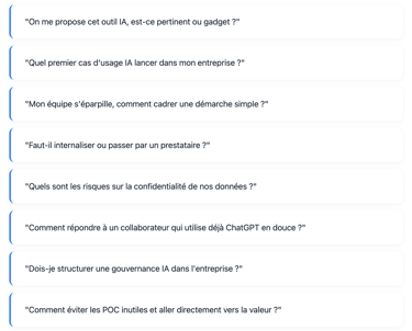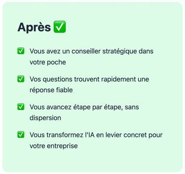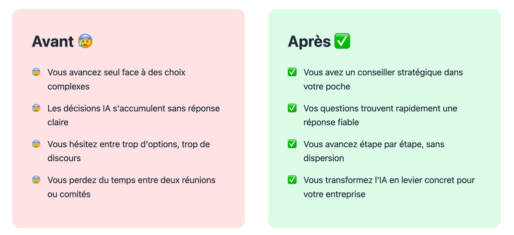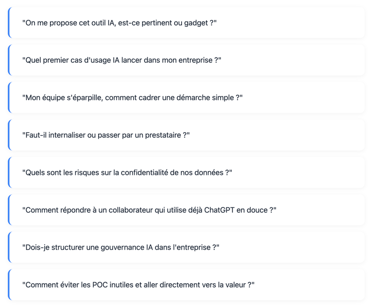 Je réponds 7/7 à toutes vos questions stratégiques sur l'IA de façon rapide et confidentielle,