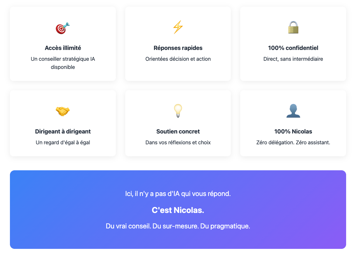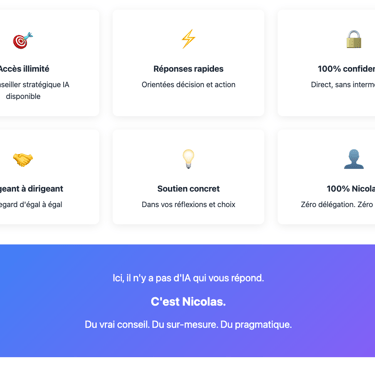 "Un échange direct, clair, sans jargon. En 10 minutes, Nicolas nous a aidés à prendre une décision que nous repoussions depuis des semaines."